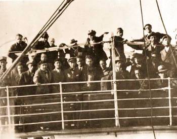 Το καράβι που μετέφερε τους εξόριστους στον Αϊ - Στράτη. Κάτω σειρά: δεύτερος από αριστερά, με μπερέ, ο Δ. Γληνός και τέταρτος, με τραγιάσκα, ο Βάρναλης |